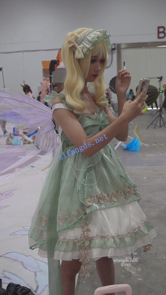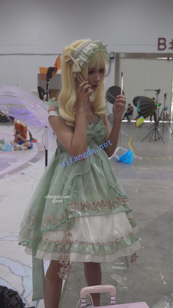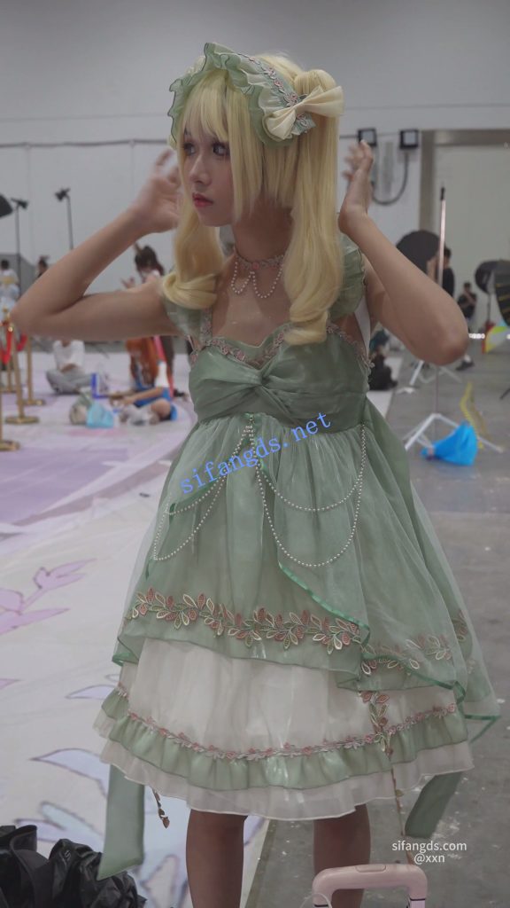 •  双马尾蕾丝裙美女,穿了裙撑裙子非常短,里面竟然无打底,浅黄内前后CD。